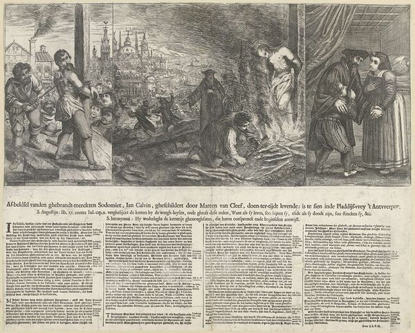Curator: This engraving, dating back to the 19th century, depicts a 15th-century miracle in Alkmaar, related to the Eucharist. I see three distinct scenes framed within the larger print. What's your initial reaction? Editor: It feels like a comic strip, almost, or maybe an early form of illustrated journalism? The images are quite small and densely packed, and there's a lot of text accompanying them. How do you interpret this work in its historical context? Curator: It’s important to understand this as a form of historical narrative but also political tool. Consider that such prints often served as forms of proto-news disseminating stories favorable to particular religious or political viewpoints, especially at moments of intense socio-political change and negotiation. It’s interesting how these images work to authenticate a very local and particular miracle through detailed scenes. What stories do you think it tells about power structures present in that era? Editor: It suggests the church and its rituals were central to community life. And if this miracle validated those rituals, it gave the church a lot of influence, I suppose. But also, the text seems crucial – it grounds the visual in written "truth." Curator: Precisely! Think about how the "truth" of the miracle serves specific ideological purposes within a society undergoing constant negotiation about authority, faith, and local identity. To whom might it appeal in the 19th century when it was produced and disseminated, and what were they hoping to achieve? Editor: That’s a lot to consider. I suppose people at the time used it as a symbol for hope. This miracle would've showed that even ordinary folks in Alkmaar, still, could be part of a divine narrative. It could give them something to grasp onto. Curator: Exactly. The engraving doesn't just show an event; it also actively shapes and reinforces particular beliefs and identities tied to community history and power. It reminds us that art can serve as a potent form of storytelling.