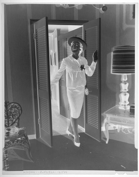Curator: Up next is an untitled fashion portrait by Martin Schweig, currently held at the Harvard Art Museums. The photographic print measures about 5 by 4 inches. What strikes you about this image? Editor: The starkness. It feels like a snapshot of a very particular, perhaps fleeting, moment in time, one very concerned with the performance of femininity. Curator: Indeed. I'm interested in how Schweig uses the photographic process here. The stark contrast emphasizes the textures of the dress and the glove. What does this say about the labor involved in image making? Editor: It's also fascinating to consider how this image, regardless of the artist's intent, could be seen as either celebrating or critiquing the fashion industry. Curator: Precisely! It really highlights how the final presentation can dictate the image's socio-political impact. Editor: It makes you wonder about the relationship between the artist and his subject, too. It’s a striking image. Curator: Agreed; there's much to unpack here about both process and context.