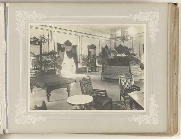 Otto Hisgen created this silver gelatin print, "Eetzaal," where the visual experience is dominated by a structured, almost theatrical perspective. The composition leads your eye down the long axis of the room, framed by vertical architectural elements. The monochrome palette lends the scene a sense of timelessness, emphasizing the geometry of space over the specifics of color. The photograph plays with the push and pull between interior and exterior. Light floods the room, blurring the boundaries between the architectural space and the outside world. Hisgen is exploring the semiotics of space, where the dining room becomes a stage for social rituals, framed by elements of bourgeois life. The plates on the wall, the arrangement of the furniture, and the very structure of the room communicate a particular cultural code. The photograph's formal qualities invite us to consider not only the aesthetic of the space but also its function as a setting for social interaction and display. Consider how this photograph captures a moment in time. It encourages us to reflect on how space and structure play a role in staging our lives.