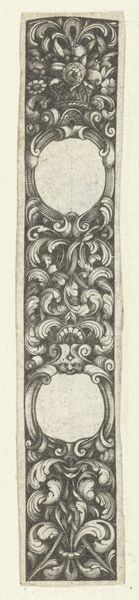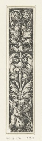 Sebald Beham created this "Vlakdecoratie met onderaan een gehurkte sater" in the 16th century. The artwork is composed of symmetrical patterns and classical motifs, constructed with fine lines on a small vertical scale. This dense ornamentation evokes a sense of crafted precision. Beham employs symmetry to structure the composition; the arrangement of vases and foliage creates a balanced visual rhythm. The recurring motifs and their calculated placement suggest an intellectual interest in order and harmony, reflecting the era’s humanist values. The satyr at the bottom introduces a contrasting element. It disrupts the rigid verticality and abstract perfection of the classical motifs, and its inclusion hints at the tension between the rational and the irrational in Renaissance thought. In summary, the interplay between the ornamental structure and the figure is a negotiation between ideal form and the destabilizing force of nature. This contrast invites ongoing interpretation into the cultural values of the time.