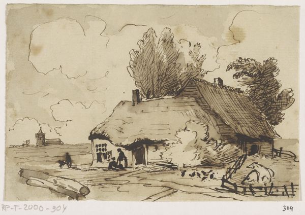 Editor: So, this is "Woning bij bosrand," or "House by the edge of the forest," by Pieter Ras, from 1930. It's a pencil drawing, and there's a melancholy feel to it, with the starkness of the landscape. What catches your eye in terms of its cultural and historical context? Curator: I'm immediately drawn to the accessibility of the medium. Pencil, paper – these were materials increasingly available, allowing a broader segment of society to engage in artistic production, not just observe it. Consider the shift away from solely commissioned portraits of the wealthy; this sketch suggests a more democratic approach to artmaking. What kind of labor do you think went into the production of these materials? Editor: I hadn’t considered that! Presumably, the labor involved in producing the pencil and paper, making art creation itself more widely accessible… How did this democratization of art materials influence artistic subjects? Curator: Exactly! The choice of subject – a humble dwelling, the edge of a forest – speaks to an interest in the everyday. It moves away from idealized landscapes to a grittier reality. What about the material application - does the artist call attention to craft? Editor: I guess it does. The lines are rough and the textures coarse, but it could also be a quick sketch, prioritizing capturing the scene efficiently rather than creating a highly polished drawing. It is impressionistic. Curator: Precisely, and that sketch-like quality highlights the act of observation and production. Think of the time spent creating this: from material production to its artful manipulation in recording everyday spaces. And how does the accessibility of materials interact with the final work presented to the art viewer? Editor: This has made me reconsider how everyday materials shaped not just art *making* but also its subjects and potential audiences, beyond purely aesthetic considerations. Curator: Me too. Looking beyond the landscape we must recognize it as another product consumed by contemporary viewers like you and me, which invites more people into the conversation!
