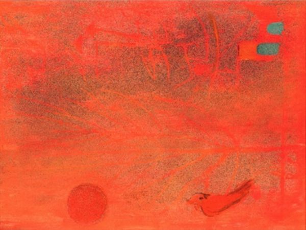 Alexander Calder created this gouache painting, sometime around 1963, with simple shapes and runny paint. I just love his approach to artmaking, it feels so free. He embraces the process, letting the paint do its thing, which gives it this really cool, almost accidental quality. Looking at the surface, you can really see the physicality of the medium. The red background is like a wash, thin and transparent, while the circles are more opaque. And those black marks! They’re like little explosions, splattering across the surface. It’s as if he dripped the paint and then let gravity take over, creating these organic, branching forms. They remind me of Rorschach blots, inviting you to see something in their abstract shapes. I'm reminded of Joan Miró, both artists share that playful, anything-goes approach. Ultimately, it's up to you to decide what this "Mystery" is all about, and that's the beauty of art, right?
