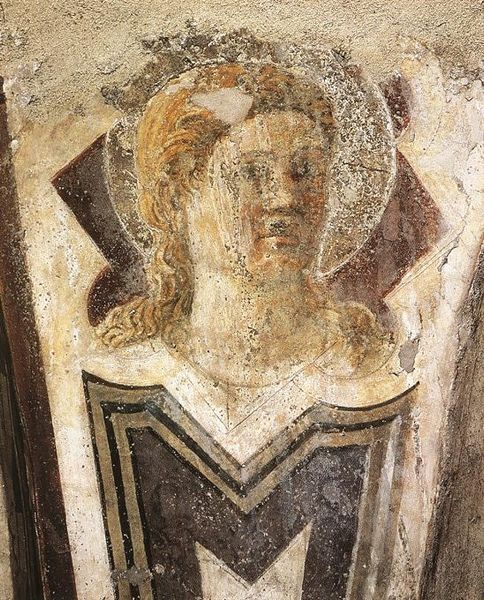 Curator: Standing before us is Piero della Francesca’s "Angel," a fresco dating back to 1452. It resides within the Basilica of San Francesco in Arezzo, Italy, part of his larger cycle depicting the Legend of the True Cross. Editor: The first thing that strikes me is its stillness. The colors, softened by time, create a remarkably serene mood, almost as if the angel is holding her breath. Curator: Absolutely. And look at how Piero uses fresco, painting directly onto the wet plaster. Fresco required speed and careful planning. Each section would be applied one at a time to align to the narrative. Editor: The material process becomes integral to the overall effect; the pigments, lime, and water interacting to create this matte, earthy surface. How does it impact your thinking about gender, race, or politics here? Curator: It brings to mind discussions of Renaissance ideals of beauty and how these informed the perception of marginalized groups. The angel's features, though idealized, still exist within that societal construct, don't they? There is a whiteness assumed in depictions like these. Editor: That's undeniable. Focusing on the tangible realities – the availability of pigments, the local plaster, and the economics of labor that dictated the pace – offers another lens. The halo, for instance: did the artist use precious metals to suggest holiness and how was he sourcing it at this time. What does this say about wealth or poverty in this community? Curator: The placement within the Basilica, alongside scenes of warfare and imperial power, underscores a complex intersection between faith, class, and political agendas, yes? She seems to hover above this intersection and maybe is used to comment or to show some sense of balance within this world. Editor: And balance, in the materiality of it all – balancing speed with permanence when working on the fresco to bring the biblical text into a concrete representation. We can think through social realities if we begin to analyze the real resources or social practices that produced art history. Curator: By situating this artwork in a broader intersectional narrative, we might find resonance and relevance in today’s world in that tension between peace and war that plays on repeat across our communities. Editor: Looking closer at the means of production encourages questioning established narratives; art becomes less about perfect representation and more about reflecting—sometimes unintentionally— the material and social realities of its making.