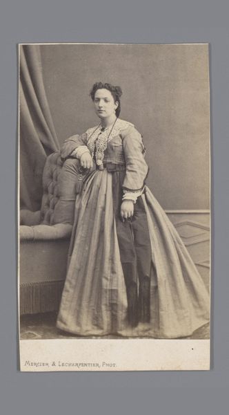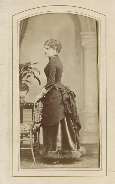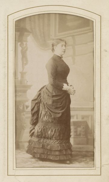 This small portrait of a standing woman with a high hat, fan, and overskirt was created by J. Oses. Though we don’t know precisely when it was made, the details of her clothing suggest it was sometime in the late nineteenth century. This was a time of significant social change, particularly for women. As they began to participate more in the public sphere, their fashion became a way to express their identity and status. The woman’s elaborate hat, adorned with flowers, and her carefully chosen attire speak to her social standing and the importance of appearance in that era. However, the portrait also hints at the constraints placed on women. The tight corset and formal pose reflect the expectations of female decorum. In viewing this photograph, we can reflect on the complex interplay between personal expression and social expectations that continue to shape our identities today.