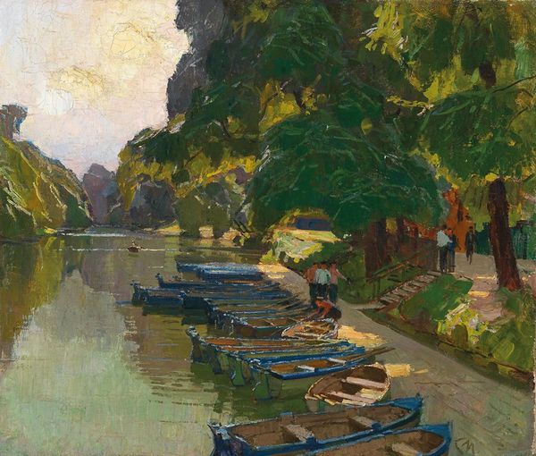 Editor: So here we have Renoir's *The Seine at Argenteuil*, painted in 1888. It's oil on canvas, and depicts a very serene river scene. I'm really struck by how vibrant the water is. What stands out to you in this painting? Curator: What I see here is not simply a landscape, but a portrait of leisure and burgeoning social change. The figures in the boat, are they working or at play? The context is the rise of the *banlieue*, a space both connected to and separate from Paris. Who has access to this space, and for what purpose? Consider who *doesn't* get to leisurely row down the Seine. Editor: That's interesting. I hadn't thought about it like that, I was just admiring the pretty colours. So you are saying the painting is speaking to the dynamics of class? Curator: Exactly! Impressionism often obscures the harsh realities of 19th-century France by focusing on beauty. But look closer. Who could afford leisure time? Whose labor created that leisure? Are there suggestions about gender roles here, with the women in the boat being observed rather than active participants in industrial society? Editor: Wow, now the idyllic scene seems to carry much more weight. I notice now that there is almost an audience, suggested in the background... How do you think Renoir positions himself in this social commentary? Curator: That is the vital question! Is he celebrating this scene uncritically, or subtly questioning it? Is he simply portraying his reality, or does the perspective tell us more? Exploring his other works could help us determine whether Renoir's inclusion of the women on a leisurely jaunt is a comment or an innocent depiction of everyday life. Editor: I never knew one painting could speak to so many cultural layers. I will definitely look at this painting, and others, with new eyes from now on.