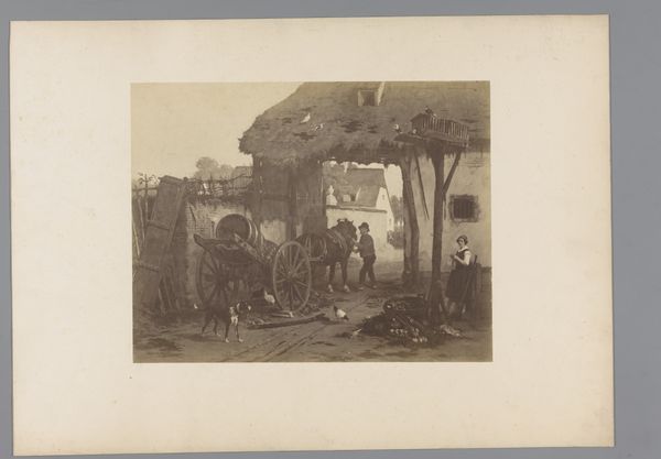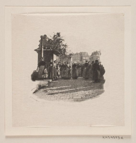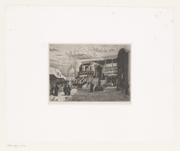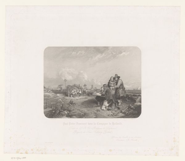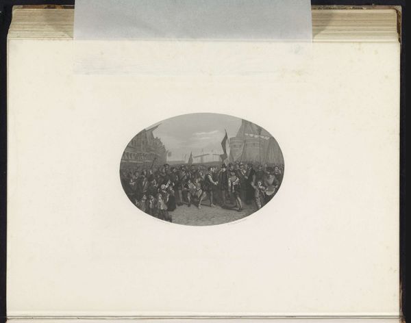 Curator: What a wonderfully detailed print. This is Johan Conrad Greive’s “Gijsbrecht van Aemstel laat een dam in de Amstel aanleggen,” created in 1876. Editor: It’s… intricate, certainly. My first impression is of bustling activity, all rendered in a rather muted palette. There’s a lot to visually unpack in this landscape. Curator: Absolutely. Greive is illustrating a pivotal moment in Amsterdam’s history—Gijsbrecht van Aemstel ordering the construction of the dam on the Amstel River. It’s foundational, quite literally. Editor: And structurally fascinating. The linear precision of the engraving gives it a compelling clarity despite the chaos of the scene. The lines articulate everything from the waves to the textiles. Curator: What I find compelling is the public performance of civic duty on display here. Look at the figures, both observing and participating. This wasn't simply an engineering project; it was a demonstration of leadership, solidified for public consumption. Greive is participating in the city's historical narrative and also shaping contemporary views on the same events. Editor: Yet, technically, I'm drawn to how the line directs the viewer’s eye—from the foreground figures to the construction, eventually leading us to the architecture of the city itself. The interplay of light and shadow, though subtle, provides a distinct spatial depth. Curator: He emphasizes the relationship between the city's past and its present—its creation is not something isolated, it exists continuously, shaping its identity and destiny. Greive makes a political statement about Amsterdam’s resilience, innovation and even about Dutchness at a very particular period of state building. Editor: I see your point. The artistic choice is an alignment with this historical positioning, not only capturing a moment but also promoting its cultural value to Amsterdam's vision of itself. It certainly gives the viewer a lot to think about when looking closely. Curator: Indeed. It gives us so much food for thought, demonstrating how historical moments and their representations evolve and how a sense of place and collective identity takes shape. Editor: I agree completely; my experience of art like this always leads me to the fundamentals of form and technique— the aesthetic impact, I feel, enhances and elevates those social dimensions you identified.