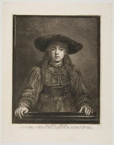 Curator: Immediately I’m drawn to the unusual hat—it’s a real statement piece, isn’t it? Almost masculine against the frothy lace. Editor: Yes, it’s arresting! What we have here is an engraving from the 18th century depicting Anna van Hannover, created by J. de Groot. It feels like an attempt to capture both her royal status and…dare I say, a touch of her personality? Curator: Personality for sure! I can almost feel the energy radiating from the piece, even in monochrome. There’s such subtle gradations in tone that create such depth. Do you find the symbolism rich, here? Editor: Immensely! Look at the way the symbols of power – the crown, the coat of arms – are almost… secondary? Tucked into the background. The focus is undeniably on Anna herself, and her very conscious construction of gender. The lace, contrasted by the masculine-coded hat. It's a playful ambiguity. Curator: Absolutely! There's also that fascinating tension between the rigid formality we'd expect from a royal portrait of this period and this palpable sense of individuality. It’s history-painting, certainly, but painted with such flair. I also get a sense of warmth, not really like a powerful person, maybe like one of my grandmothers. Editor: I see that. Considering the fashion, which leans towards the baroque, it certainly is not static. Maybe that hat represents her ambition, that subtle dig towards androgyny which speaks volumes! It’s a woman quite consciously stepping outside prescribed roles. Curator: A woman with ambition in every mark made by the engraver’s tool, indeed! This piece makes you wonder, doesn't it, about who these figures were beyond the pomp and circumstance? Editor: Precisely! And the skill of de Groot to have woven it all together through symbolic presentation is marvelous! Curator: I'll walk away contemplating gender ambiguities, for certain. Editor: Likewise. A remarkable capsule of individual ambition meeting visual storytelling.