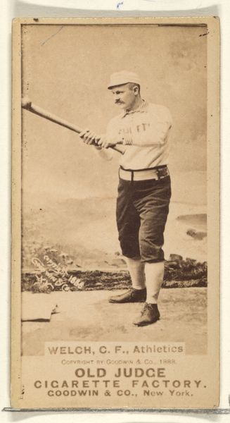 Editor: Here we have a photograph from 1888, entitled "Hubert B. 'Hub' Collins, Left Field, Brooklyn, from the series Old Judge Cigarettes," by Goodwin & Company. It's a gelatin-silver print. I’m immediately drawn to the player's confident stance and the crispness of the image. How do you interpret this work? Curator: Indeed. Note the tonal range achieved with gelatin silver. Observe the subtle gradations that model Collins' form. The photographer's skill lies in harnessing the medium's capacity for precise detail to convey not only likeness but also, arguably, the character of the subject. The placement of the figure is central, wouldn't you say? How the composition reinforces a certain ideal or expectation related to turn-of-the-century ideals about sport or manhood. Editor: Yes, the stark background and centered figure do command attention. So you're suggesting that beyond the portraiture, the very way it's staged tells a story about the values of the time? Curator: Precisely. The clarity with which every aspect of his figure, the position, and equipoise with his bat, contrasts with the more indeterminate rendering of ground. Do you perceive any tension created by this imbalance? Editor: I see what you mean. The image, despite its documentary feel, becomes an ideal, constructed through its formal choices. That contrast highlights what the photographers thought most worth portraying through careful detail. I didn't realize how much a seemingly straightforward photo could communicate. Curator: The formalism unlocks the layers beyond the apparent subject. A baseball player becomes an icon, shaped by photographic choices.