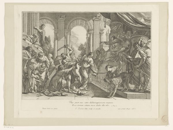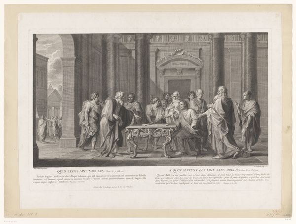 Editor: Here we have "Keizer Alexander Severus laat tarwe uitdelen aan het volk van Rome," which translates to "Emperor Alexander Severus Distributing Grain to the People of Rome." It was created around 1717 by Charles Dupuis. It looks like an engraving or etching. It seems to depict a scene of generosity and civic duty, but the body language of the people hints at underlying desperation. What symbols strike you when you see this image? Curator: What I immediately notice is the conscious deployment of classical architectural motifs - the columns, the arches, the togas. These weren't just aesthetic choices. Dupuis is invoking the Roman Empire as a cultural touchstone. In doing so, he’s imbuing Alexander Severus with the mantle of legitimate, benevolent authority. How might this resonate with viewers in the 18th century? Editor: It seems like a way to legitimize power by connecting it to a glorified past, but is there a darker side to it? Are we meant to overlook the reasons why the population needs grain in the first place? Curator: Precisely! Look at the figures clamoring for grain. Are they rendered with dignity, or are they caricatures of need? Consider, too, that images like these can serve to naturalize existing power structures. By framing acts of charity as inherent to leadership, they risk obscuring systemic inequalities. The iconographic message, while seemingly benign, implicitly reinforces a social hierarchy. Editor: So, it’s not just a historical snapshot, but a commentary on power and societal roles packaged within classical imagery? It is quite the message to decipher. Curator: Exactly. Visual language is so often loaded. Consider how artists throughout history have deployed similar techniques to shape perception and reinforce ideology. What did you make of the text beneath the image? Editor: Right! It reinforces the idea of a "good prince," emphasizing this act as salvation. This piece shows how images and text can combine to perpetuate a very specific narrative. Curator: And how those narratives, when repeated across time, become deeply embedded in our collective cultural memory. It’s fascinating, isn't it? Editor: Absolutely! It is amazing to understand how much history and political commentary are interwoven in the art from the past.