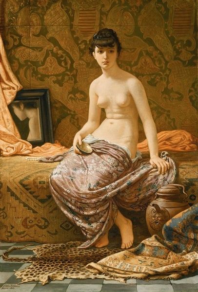 Elihu Vedder created this oil on canvas painting, "Study for Odalisque." He skillfully manipulates the texture of the paint to evoke different materials – the smooth skin of the woman, the folds of fabric, and the reflective surfaces of the metal objects around her. The painting appears quickly executed, with visible brushstrokes adding a sense of spontaneity. Vedder’s technique recalls the academic tradition, but he was also absorbing impressionism during the period. This piece is a study, meaning it likely served as preparation for a larger, more finished work. The labor is evident not just in the final image, but in the process of learning and refining the artist’s skill, and in his conscious decision to produce the canvas in this manner. By focusing on these aspects of the material and making, we can appreciate how this artwork transcends the conventional boundaries between fine art and craft.