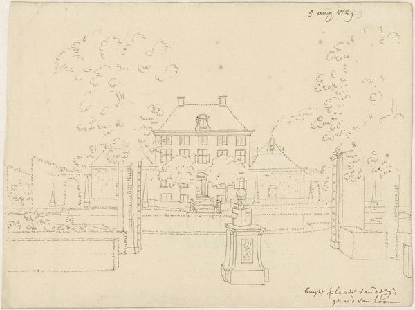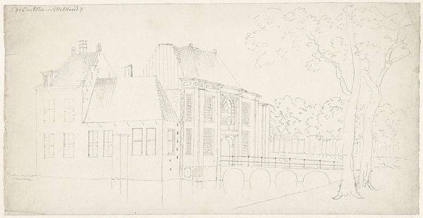 Curator: This drawing by Cornelis Pronk, made around 1730, depicts Het Kasteel Molencaten bij Hattem. The artwork is rendered in pen and ink on paper. What strikes you first about it? Editor: It's incredibly delicate, almost ephemeral. The lightness of the lines and the faded quality of the paper give it a sense of something fleeting, like a memory. Curator: That's a keen observation. Pronk was a master draughtsman. His detailed sketches, like this one, were often commissioned to document topographical views of estates and buildings across the Dutch Republic. Think of him almost as a recorder of a specific cultural moment. He captures not just the physical structure, but also aspects of social life through this setting. Editor: So, this wasn't just an artistic exercise, but also served a very practical, perhaps even political, purpose. Who was the intended audience, and what kind of power did they wield that necessitated such detailed documentation? It almost reads like architectural planning meets social documentation. Curator: Precisely. The elite classes commissioned these views. Patronage connected to networks of power is inherent in the image itself. The drawing emphasizes precise lines and meticulous detail in the architectural elements, which were enabled through developments of drawing and etching tools. The quality of the paper also speaks to luxury. Editor: It's interesting how the delicate style seems at odds with the socio-economic realities it hints at. A subtle tension plays between the airy presentation of the work, and the weighty implications surrounding the wealth that supports its existence. There's a story here about the very fabric of 18th-century Dutch society. Curator: Exactly. Examining Pronk’s practice allows us to reflect on artistic production as work. And through material analysis of the paper, inks and other media, we can unpack a great deal of its contemporary market dynamics. Editor: Seeing it that way truly enhances how I engage with the image. It goes beyond a mere landscape and becomes a point of entry into social and historical contexts that speak to issues of class, labour and identity. Thank you for broadening my perspective. Curator: My pleasure, it enriches my viewing of the artwork as well.
