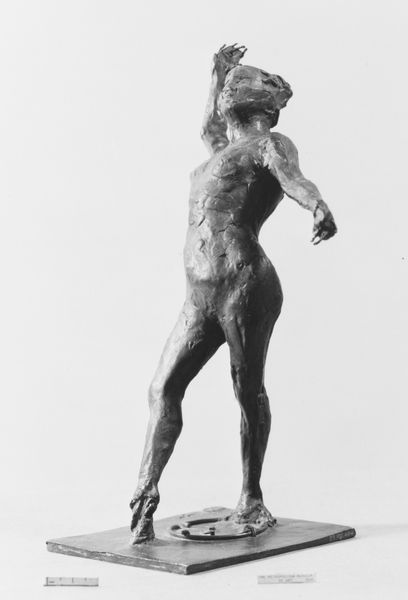 Editor: Here we have John Börjeson's "A Young Faun," sculpted in bronze sometime between 1850 and 1907. I'm struck by the figure's languid pose and how his gaze drifts downward. It makes me wonder what’s capturing his attention, what thoughts he's lost in. What do you make of it? Curator: Oh, he’s delicious, isn't he? In this classical-realist style, Börjeson’s given us a perfect little reverie in bronze. The contrapposto stance is so beautifully observed; look how the weight shifts and creates these delicious curves and tensions. I like to imagine he’s just noticed his own shadow stretching long in the late afternoon sun and is, perhaps, pondering his place in the universe – or just wondering what’s for supper! Does that resonate for you at all? Editor: I hadn’t thought of it that way! I was so focused on his slightly melancholic air, I missed the playful possibilities. You mentioned his shadow, and that makes me see his downturned face in a new way. Curator: Exactly! These fauns, you see, they’re mischievous spirits, creatures of the forest – but even mischief gets tiring. Börjeson’s brilliance, I think, lies in capturing that fleeting moment of introspection within the mythical being. You see the world through fresh eyes. Editor: This sculpture is teaching me to be more attentive to that meeting point between classical imagery and humanness. Curator: Beautifully put. Perhaps, in the end, Börjeson is showing us that even the wildest hearts sometimes pause to reflect. It’s that human-animal dance! Editor: I love the image of the dance! Thank you! Curator: My absolute pleasure. Until the next reverie, then.