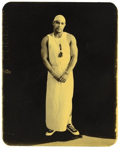 Editor: This gelatin-silver print, "Stephen Walder, Angola, Louisiana" by Deborah Luster, was created in October 1999. The man's intense gaze is quite striking. What stories do you think this image holds? Curator: The gaze is definitely key. Given Luster's sustained engagement with marginalized communities, particularly those affected by incarceration in Louisiana, this portrait compels us to confront power and representation. The “Angola” in the title references the Louisiana State Penitentiary, one of the largest maximum-security prisons in the US. Editor: So, you think the portrait's power comes from knowing about the prison context? Curator: Precisely. It challenges us to think critically about how we see and judge individuals within a system marked by racial and economic disparities. How does his style -- the bandana, the tank top, the gold teeth -- play into stereotypes? Editor: I see your point. Are you suggesting Luster is using realism to break down stereotypes and question systemic issues? Curator: In a way, yes. Luster's portrait operates on multiple levels. While documentary in style, there is also a collaborative element to portraiture. Do you think Luster and Stephen are commenting on notions of identity and visibility within this oppressive context? Editor: It makes you wonder about his life, his story, and how the system has affected him. Also, what about the choices of Luster? Does she perpetuate the stereotypes, or does she subvert them? Curator: Exactly! The ambiguity is powerful. The photograph becomes a platform to contemplate broader issues of social injustice, racial profiling, and the very human cost of incarceration, right? Editor: Right. Thanks to your perspective, I see this portrait now as so much more than just an image of a man, but a poignant visual statement about systemic problems.