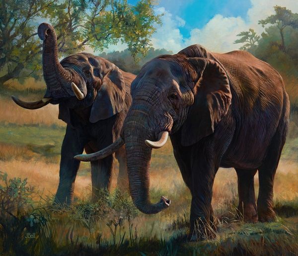 Editor: This is "Madison River Morning," an oil painting by Julie Bell. It depicts bison in a serene landscape setting. I'm struck by the almost palpable sense of quietude and the palpable feeling of a crisp morning in the mountains. What draws your eye to this piece? Curator: Ah, yes. This piece whispers, doesn’t it? Immediately, the light grabs me – how it caresses the fur of the bison and dances on the water. It feels almost dreamlike, as if we’re peering into a memory. I find myself wondering, what is it about landscapes with animals that pulls at our heartstrings? Is it some primal connection to the wild, or something more? Editor: It could be! The realism is stunning, but there's also an almost ethereal quality, don't you think? The bison seem so grounded and yet... otherworldly. Curator: Exactly! It's the tension between the real and the imagined. The textures achieved with impasto lend a tactile dimension – I want to reach out and feel the thickness of their coats. And consider the composition. What feeling is evoked by that single bison drinking from the river, isolated from the rest? Editor: Maybe a sense of peaceful solitude? It seems really harmonious despite the subjects being, well, massive. Curator: I think you're right. It’s about harmony. It's a conversation between the powerful presence of these creatures and the quiet strength of the natural world around them. Almost a story unfolds before your eyes! What will happen next? I can spend hours wandering in that painted landscape. Editor: Absolutely, I can see that. I never really considered how much a painting could communicate just by contrasting these feelings of grandness and tranquility. Curator: It’s like a secret language whispered through brushstrokes. Makes you want to find your own canvas and start whispering, doesn't it? Editor: Definitely! I'll be seeing bison, and landscapes, in a whole new light now! Thanks so much for your insights.