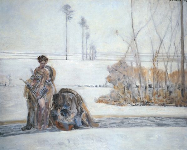 Curator: Immediately, there's something quite eerie and beautiful about this scene. The colors are muted, the landscape is bleak, and the figure is hauling this strange, colorful burden. Editor: What grabs me is this overwhelming feeling of isolation despite this landscape being part of an aesthetic. It’s quite striking. I can already imagine unpacking all sorts of themes. Curator: Let's contextualize. What we have here is "The Mainland," an acrylic on canvas work crafted in 1992 by Jamie Wyeth. It exemplifies, in many ways, narrative-art—but on first viewing, how do you relate to Wyeth's approach to landscape? Editor: Knowing that helps frame my understanding, particularly how Wyeth situates the figure in their setting. It strikes me as less of a classic landscape and more as a stage upon which a narrative of individual struggle, maybe environmental burden, is playing out. This figure is not simply in nature; they are interacting with it, bearing its weight, even being overwhelmed. Are we seeing Wyeth perhaps acknowledging climate change or its social injustice aspects decades before it gripped the mainstream imagination? Curator: Well, given Wyeth's inclinations, I would push against ascribing specific contemporary social critiques to it. The image taps into wider American historical discourses. This is not unlike works during the Depression or those addressing similar ideas about societal outcasts or pioneers burdened by material needs or seeking new frontiers in a transformed natural environment. However, I certainly can entertain those concepts because the ambiguity, in its setting or with its specific burden, is the powerful key. Editor: Fair point. This person could very well be burdened by their physical surrounding and circumstance rather than forging out of their will, something very relevant for our era. In either case, the figure's anonymity, that averted gaze and simple garb, I find incredibly poignant when considered alongside whatever commentary Wyeth might offer through such an evocative image. Curator: And speaking to its presentation, the details are really impressive and the medium does justice to it. From the slushy snow to the muted and moody skyline, the naturalistic precision grounds the painting. However, there is a surreal contrast because he uses bold acrylic paints and not just dull colors. Editor: Absolutely, that tension between the real and unreal, between hope or destruction, makes the work deeply compelling. Thank you for sharing that viewpoint, and this feels like a conversation that could extend further as more art patrons and experts discuss Wyeth's art! Curator: Exactly, it seems the deeper we look at it the more it brings into perspective about an artist and American Art, and our changing perspectives on the landscape's significance.