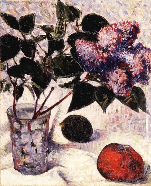 Curator: Look at this, an oil on canvas still life by Samuel Peploe, dating from 1923, titled "Pink Roses in a Japanese Vase". Editor: Hmm, initially, I find myself quite captivated by the interplay of textures—the almost velvet quality of the roses against the smooth coolness implied by the vase. There’s something profoundly delicate yet grounded in its presentation. Curator: Absolutely. Peploe was part of the Scottish Colourists, and here we see that preoccupation with paint handling and direct engagement with objects as form and material. The visible impasto tells us about his process. Editor: Indeed, that raw immediacy breathes so much life into the painting. But do you sense the odd loneliness, though? Those roses, for all their vivacity, appear almost stranded against that cool background and austere surrounding books. Is this a statement of alienation despite beauty, perhaps? Curator: It could very well be a response to, or reflection on, the increased commodification and global movement of goods evident in the 1920s. Peploe engages with a Japanese vase—an imported item signifying particular trade relationships at that time. Editor: You know, considering its rather unassuming name, this work does provoke such contemplation of bigger human dramas playing out quietly in the still life. The way he contrasted the imported vase with ordinary objects and blooms—quite profound! Curator: The materiality then becomes almost symbolic: consumption, beauty, even transience become tied together within his style, a type of post-impressionism, yet intensely material and relevant. Editor: And those colours! That arresting cobalt tablecloth paired with the pale rose tints... He's weaving together feelings with shades and shapes in such a masterly way. Thank you, Mr. Peploe. Curator: Agreed; it’s a potent combination to analyze. A good consideration of materiality and what it suggests of the era.