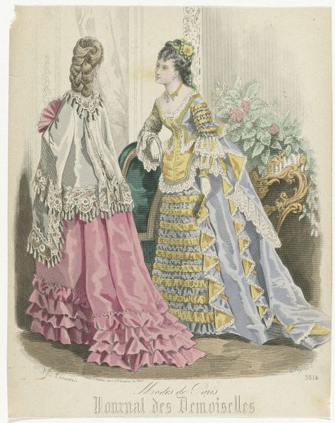 Curator: Oh, this image feels terribly… restrained, somehow. Elegant, yes, but there's a wistful quality I can't quite place. Editor: This is "Illustrirte Frauen-Zeitung, 14 April 1879, Pl. 394: Brautanzug. Prinzessrob," an engraving that appeared in an illustrated women’s journal from 1879. Curator: "Prinzessrob"—"Princess Robe?" Is that what she's wearing? It does seem like something a fairytale princess might don if she was about to marry a frog, or perhaps an aging king. It's all ruffles and seriousness. Editor: It’s a study of feminine ideals as presented through the lens of fashion. The detail is striking, especially considering it was printed in a mass-market publication. Look at the way the fabric drapes and folds! But consider the layers here – this isn't just about clothing. The image engages with the politics of presentation, societal expectations around marriage, and, importantly, class distinctions reflected in adornment. Curator: Do you think she chose that fan herself? The second woman—or the angle of it, her head—just says: "I do not approve." There's something of a silent melodrama unfolding. Perhaps I'm projecting. But yes, that sumptuous texture almost distracts you from what those women were meant to project: docile beauty? Editor: Precisely. And that's where the tension lies. Fashion journals offered aspirational images but simultaneously reinforced constraints. A woman's value was, and continues to be, relentlessly tied to appearance. This engraving, I think, exposes that struggle—the woman trapped within the finery, yearning for something beyond societal scripts. Or at least wondering what someone might whisper behind her back at any moment... Curator: Perhaps it's not melancholy but rather simmering rebellion? It’s like she knows what is to come: babies and whispers...and this robe is more shroud than gown? Editor: Absolutely. Seeing the artwork now, more than a century later, we bring a fresh interrogation to what was, at the time, merely advertising. What can seem beautiful on the surface, with just a little probing, exposes the uncomfortable reality. It's about learning to look beneath that surface of representation. Curator: Indeed. There is almost an invitation in that stare... to reconsider a world draped in frills, which is asking to be, well, unfrilled.