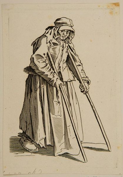 Editor: This is Jacques Callot's "Beggar with a Wooden Leg," an etching from the early 17th century, housed at the Harvard Art Museums. The figure feels burdened, yet there's a strange dignity. What symbols jump out at you? Curator: Notice the hat with the feather, the crutches, the wooden leg itself. Each speaks volumes about societal attitudes toward disability and poverty, doesn't it? Think of them as visual metaphors for resilience and marginalization. Editor: So, the image isn't just about depicting a beggar, but about… Curator: …invoking cultural memory. Callot uses recognizable visual cues to tap into collective understanding of the beggar archetype, imbuing the figure with pathos and, perhaps, even a bit of defiance. It reveals the psychology of both the giver and the receiver of charity. Editor: I never thought of it that way, it's more than just a portrait! Curator: Exactly. These enduring symbols connect us to the past, prompting reflection on how we perceive and treat those on the fringes of society even today.