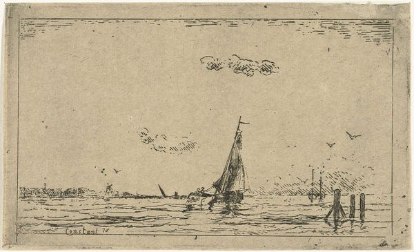 This is "De kleine lagune," an etching by James Abbott McNeill Whistler. Observe how the composition, with its muted tones and delicate lines, evokes a serene and almost dreamlike atmosphere. Whistler's approach to art was deeply influenced by the concept of "art for art's sake." Note how the structure and composition of the piece challenge traditional landscape painting. The horizon line is set high, pushing the lagoon into the foreground. The artist is using a semiotic system of signs to emphasize the aesthetic experience over narrative content. The lines create a sense of depth while maintaining a flattened perspective. In his formal arrangements, Whistler invites us to appreciate the intrinsic beauty of the scene. The arrangement of shapes and the tonal harmony create a visual experience that transcends mere representation. This etching exemplifies Whistler's belief in art as an aesthetic arrangement, inviting endless interpretation.