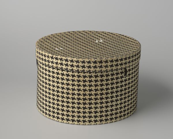 This round hat box was made from cardboard and paper by Maison de Bonneterie. It's got this really appealing, all-over plaid pattern that just screams vintage charm. The way the lines intersect, creating these little windows of color, is so satisfying. It's fascinating how something so utilitarian can be so visually engaging. The surface is smooth, of course, being paper, but the pattern gives it a kind of textural depth. Look at how the green handle provides a subtle contrast to the red, brown and yellow. The whole thing feels so considered, from the color choices to the precise application of the paper. You know, seeing this makes me think about artists like Al Held, who also played with geometric forms and color relationships to create dynamic compositions. Both seem to know that art isn't always about high-minded concepts, it can also be about finding beauty in the everyday.