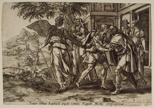 Editor: This is a print by Crispijn de Passe the Elder, titled "Scene from the Story of Tobias." It depicts figures in a rather dramatic embrace! What strikes me is the level of detail achievable with this early printmaking technique. What catches your eye? Curator: It’s the raw emotion, isn't it? De Passe captures this biblical scene with such a tender, almost familial intimacy. Forget the divine for a moment; it’s about the human connection, the joy of reunion, isn't it? Editor: Absolutely. I hadn't considered that familial aspect so strongly. I was focused on the technical skill. Curator: Sometimes, it's the simplest stories that resonate most deeply, don’t you think? Especially when rendered with such humanity. Editor: Definitely gives me a fresh perspective. Thanks!