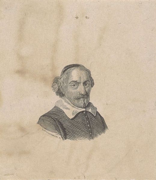 Editor: So, this is Isaac Weissenbruch's "Portrait of Joost van den Vondel," made sometime between 1836 and 1912. It’s a drawing, I believe pencil and etching on paper, and there's a sort of austere formality to it. What's your read on this portrait? Curator: What interests me most is understanding how the labor inherent in drawing and etching elevates or diminishes Vondel's status. We see marks, the trace of Weissenbruch’s hand. This wasn’t a quick sketch, so what choices led to these materials? How readily available were they and for what social strata? Editor: That's a good question. So the medium impacts the message. The artist chose these materials and this reproducible format. How would that have affected the reception of this image? Curator: Exactly. Consider too the economic conditions of artistic production in Weissenbruch’s time, influencing material choices. Etchings allowed for wider distribution. This piece prompts consideration of access to imagery. Was Weissenbruch thinking about democratization of the image, of disseminating Vondel's likeness, or was this merely commercial activity? The etching flattens the subject while being materially accessible. It speaks to the relationship between art, labor and the consumption of images. Editor: I didn't even consider that this was reproducible, and what implications this might have on reaching broader audiences, thus enhancing Vondel’s visibility, while still serving a material purpose of economic necessity. Curator: Precisely. It transforms a portrait from a singular object of elite consumption into a commodity, changing our relationship with the sitter himself. The choice of etching directly reflects on this, and it changes everything about the 'aura' of the subject. Editor: I see, the 'how' influencing the 'why'! Curator: Indeed, and I now see the materials with renewed consideration!