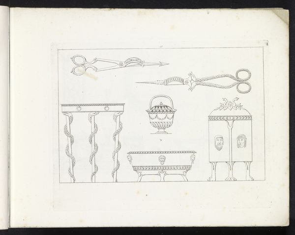 Editor: So, this ink drawing from 1817 by Pietro Ruga is titled "Oliebrander, kast en kan" which translates to "Oil burner, cabinet and can." It features line drawings of these three objects, very geometric and precise. I find its austerity intriguing, almost cold. How do you interpret this work, especially given the time it was created? Curator: Well, let’s think about Neoclassicism, the art movement Ruga was part of. It wasn't just about aesthetics; it was deeply intertwined with the socio-political climate. The rigid lines and idealized forms, the references to antiquity—it’s all a reaction to the perceived decadence of the preceding eras. Editor: So, the “coldness” I sense isn't accidental? Curator: Precisely. These objects, rendered with such exactitude, are meant to evoke order, reason, and stability, values that were particularly appealing after the French Revolution. The domestic setting here feels staged, like a performance of order in the face of potential chaos. Where do we place this type of 'order' in our modern, late-stage capitalistic lives? Does its purpose hold or is it merely aesthetic now? Editor: That's fascinating. I hadn't considered the political implications so explicitly. So, the very choice of depicting these domestic objects in such a formal way becomes a statement? Curator: Exactly! It suggests a desire to impose control and rationality onto the domestic sphere. What might be the effect of the scale of these items--could this communicate something? How does this drawing play into the larger narrative of power, gender, and the idealization of domestic life in the 19th century? Editor: Thinking about it now, it is a bit strange that items like these were displayed as opposed to human likeness or depictions of heroism as common throughout history...Thanks, I will have to rethink the symbolism I once found common-place! Curator: Of course. Thinking about Art isn't just 'beauty' as a static item, it is the ongoing dialogue of history with ourselves and the greater political contexts which inform them.