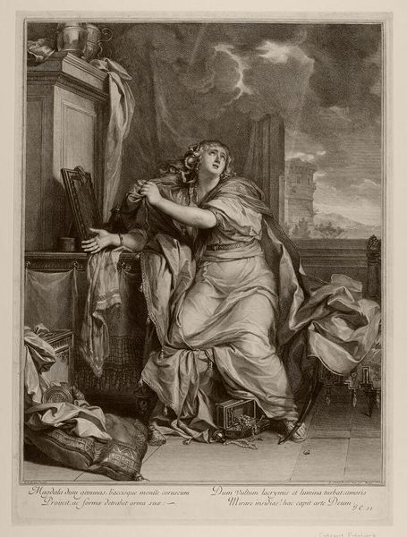 Wilhelm von Kaulbach made this engraving, "Gretchen in Front of the Mater Dolorosa," in 1859. The image shows Gretchen, from Goethe’s Faust, distraught with guilt, her bowed form rendered through careful lines that model drapery and shadow. As an engraving, this work is produced through the industrial processes of printmaking. This allows for the mass production of images, making art more accessible, but also placing the artist in a complex relationship to labor and consumption. The medium of engraving involves a division of labor, where the artist's design is translated by skilled engravers onto a metal plate. This plate is then used to produce numerous prints, each a multiple of the original design. The linear quality and replicability of the engraving process reflects the social context of the time, marked by the rise of industrial capitalism and the increasing commodification of art. Understanding the materials and processes used, along with the social context, deepens our appreciation of the artwork, challenging the traditional hierarchy between fine art and craft.