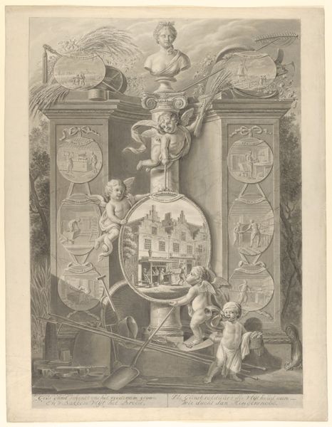 Curator: What an odd juxtaposition, visually. My eye keeps bouncing all over! Editor: You've certainly zeroed in on something about its energy. What we're seeing is Pieter van der Meulen's "Portrait of Tsar Alexander I of Russia," likely from between 1801 and 1803, part of the Rijksmuseum's collection. It's an engraving, a print, layering symbolic elements around the figure of the Tsar. Curator: The old engraving style really lends a unique quality. But it also comes off a bit...I hesitate to say it...cartoony? The house below feels disconnected from Alexander. And there’s something almost aggressively symbolic about the figures flanking him. It’s… disjointed but bold. Editor: It does embrace the Neoclassical spirit of the time. Though filtered, of course, through the lens of Dutch printmaking. It's propaganda, carefully constructed. The building at the bottom, named "Kerzuyl," anchors Alexander to a specific act of generosity – perhaps related to bestowing this property? A connection of ruler and land, ruler and people, even through a material gift. Curator: Oh! See, now that context is delicious. Knowing it signifies generosity makes the house less random and more heartening. But still, those allegorical figures...so severe, so idealized! Editor: It speaks to the ambition of the era. To shape perception. This isn’t simply a portrait; it's an act of nation-building through imagery, framing Alexander as benevolent and powerful. Someone to be looked up to! Note the eagle, the sword, and spear - very telling in their detail of symbolism. Curator: Nation-building as art direction! I do see what you mean about shaping the view through artifice. Yet, there's an enduring strangeness to it all, this blend of the grandiose and the homey, of precise technique and that faintly ridiculous feel. I still like it, somehow. Editor: Perhaps, in its very strangeness, it reveals the complexities inherent in constructing national narratives. Thank you for pointing this out. Curator: No, thank you! My pleasure! It is thought provoking to note the artist's hand at portraying nation and ruler and, perhaps also a touch of his own self-regard.