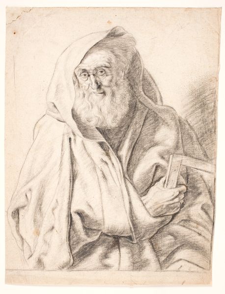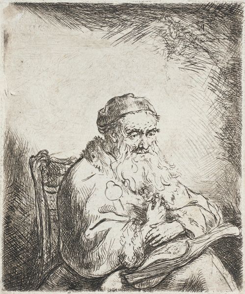 Editor: Here we have Jan Lievens' engraving of Saint Anthony. The cross-hatching is so intricate; you can almost feel the texture of his worn cloak. It’s such a stark image, almost severe. What can you tell me about it? Curator: Look at the engraving itself, how the artist utilized a copper plate to disseminate this image. Consider how this method of production democratized images of religious figures like Saint Anthony for broader consumption. Do you notice how the varying density of lines creates highlights and shadows that describe the folds of the cloak? This directs your eye and tells you a lot about how much value was placed in materiality and the details in the fabrication process. Editor: So you're focusing on the making of the artwork? The fact that it's an engraving influences the way we should understand the piece? Curator: Precisely. The accessibility afforded by the printmaking process also alters the relationship between artist, subject, and viewer. Instead of a unique painting commissioned for a wealthy patron, we have a mass-produced image available to a wider audience. It makes me think about the relationship between artistic labor and social change. Editor: That's fascinating! I never thought about the social impact of making prints more available to everyone. Curator: The artist is not simply depicting a religious icon; they're also engaging with contemporary modes of production. How does this understanding of materiality reshape your perspective on the artwork? Editor: It shifts my attention from the saint’s piety to the context in which the work was produced and how these prints themselves could have functioned in society. Curator: Indeed, this focus encourages us to investigate labor practices and systems that facilitated its dissemination. What was the role of workshops in Lievens’ time, for instance? It prompts new lines of inquiry and helps us look past iconography. Editor: Thank you; I've certainly learned to appreciate not just *what* is depicted, but also *how* it came to be.