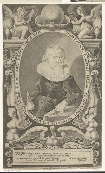 Editor: Here we have a print from 1639, a portrait of Georg von Braunschweig-Calenberg by Wilhelm Schwan. It's an engraving, so mostly line work. It strikes me as very formal, almost rigidly so. How do you read it? Curator: Indeed, the composition offers a fascinating study in contrasts. The oval frame, densely packed with heraldic symbols, creates a powerful visual boundary. Within this frame, observe how the face of Georg von Braunschweig-Calenberg is rendered. The artist meticulously crafts his likeness, but in doing so, how does the starkness of the light and shadow influence your perception? Editor: It makes his features seem... accentuated. Very pronounced. Almost like a mask. Curator: Precisely. Consider how the tightly controlled lines of the engraving emphasize texture – the intricate lace collar, the patterned doublet, the smooth planes of the face. Do these surface textures enhance or detract from the overall presence of the subject? Note the circular script – the curves play off against the heraldic emblems at top, drawing our attention to this man’s role. Editor: I see what you mean. It's like the artist is balancing a focus on the individual with all these symbols of status and power. It seems to pull the eye in different directions at once! I almost missed how tightly all the text, the decorations, and the man's figure are all in the borders of the work! I would never have noticed so much detail otherwise. Curator: A successful portrait then! We can see how formal properties and framing can create the entire narrative here.