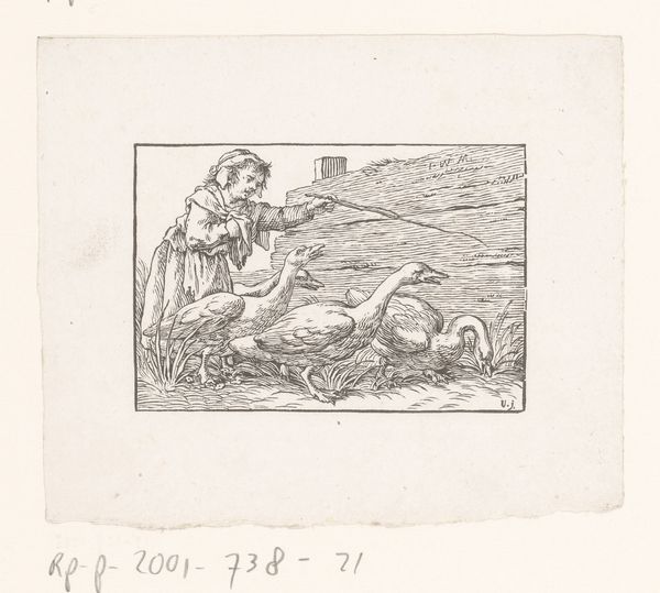 Curator: Well, isn’t this just bursting with impish energy! “Dansende nar,” or “Dancing Fool,” by Johann Friedrich Gottlieb Unger, captured sometime between 1763 and 1804, if the Rijksmuseum’s notes are to be believed. Editor: Immediately, I’m struck by the power dynamics at play. The fool’s flamboyant attire can’t distract from the violence of kicking a defenseless bush, the image feels more sinister than playful. Curator: You always bring the sunshine, don't you? It’s an etching and engraving, that old-school comic strip vibe – it's more a jester causing playful mischief. Note how the line work conveys a kind of restless glee, especially in the details of his cap and bells. Editor: Mischief is often just unchecked power expressing itself. Where does this jester get his authority? The court jester was often the only person allowed to speak truth to power – a dangerous position, only possible if one already occupies a position of privilege. Perhaps kicking at this bush is not a rebellious act, but rather an expression of frustration at his own gilded cage? Curator: Oh, now you're making me pity the fool! But the artist is using a limited number of strokes to imply great movement and perhaps commentary too. Do you think Unger intended to say something more substantial with the use of line and empty space, or are we merely overthinking this lighthearted illustration? Editor: I disagree. Unger, through his depiction, reflects society’s tendency to excuse harmful behavior under the guise of 'foolishness'. Even today, we see similar dynamics—where certain groups are given a free pass to inflict harm under the guise of humor. Curator: Okay, that’s…a reading. I saw someone prancing about being generally chaotic. Now, though, it feels like there is so much more weight attached. All these layered ideas simmering just under the surface. I suppose the fool is indeed dancing in deeper, darker waters than I first gave him credit for. Editor: And I initially saw the depths of the water, not the chaotic glee of the dance. It’s a good reminder that a single image, a single "Dancing Fool" can hold so much.