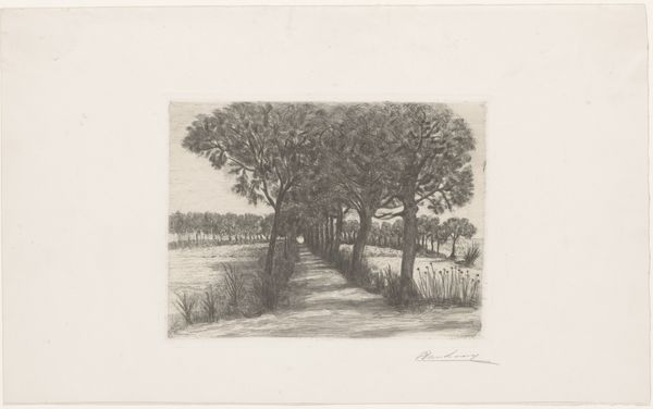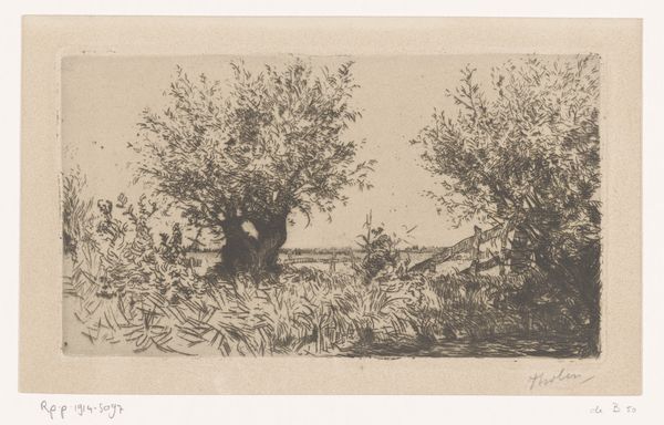 Curator: This is "Polderlandschap met knotwilgen," a landscape etching made by Arend Hendriks between 1911 and 1939, and held here at the Rijksmuseum. What strikes you initially? Editor: It's incredibly detailed for a print. All those little lines forming the trees, their reflections in the water… There's a kind of quiet stillness to it. It almost feels like a photograph at first glance. Curator: Considering Hendriks worked during a period of significant social upheaval, it's interesting how he chose to depict a seemingly timeless scene of the Dutch landscape. This focus can be seen as an intentional act, a desire to present an unchanging aspect of Dutch identity during modernization. Editor: Yes, and you can almost smell the damp earth just looking at it. The process of etching, scratching away at a metal plate and then pressing it to paper, seems to lend itself to capturing these elemental, tactile sensations of being in nature. The labor itself becomes embedded within the landscape, highlighting human intervention on it, or at least perception of it. Curator: Precisely. The knotwilgen, the pollard willows, are themselves evidence of a long tradition of landscape management in the Netherlands. This form of tree was essentially farmed for its wood, so it becomes symbolic for labor in rural, often poor communities, and land control that created it. It highlights the inherent power dynamic, one the artist acknowledges. Editor: Do you think he was commenting on this power? To me, the even distribution of light and the almost photographic stillness implies, to me at least, no moral commentary but just observation. Curator: It's an argument! Even as a study, I feel that his emphasis on these manipulated trees speaks volumes. Perhaps his dedication shows some type of reflection, even appreciation, of the struggle inherent. What a testament to the intricate relationships we forge with the land and how those labors manifest in our art. Editor: Absolutely, from the cutting of the etching plate to the shaping of trees for practical necessity, this piece displays the intertwining of making and living! Curator: A powerful reflection on the symbiosis.