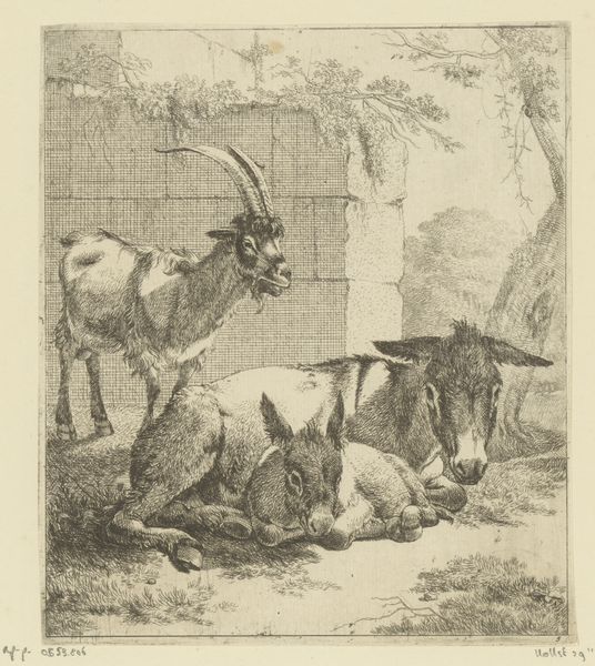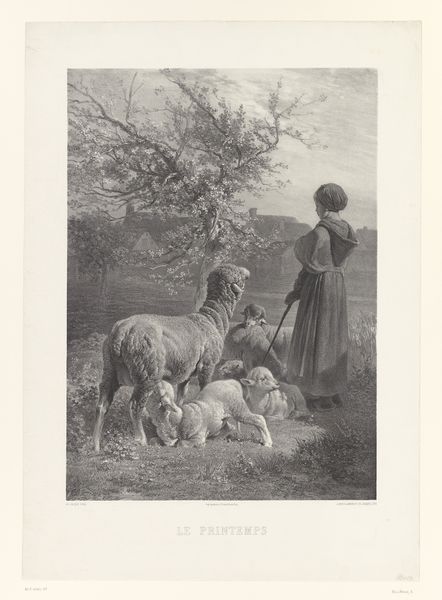 Curator: This is “The Shepherd, from Le Magasin Pittoresque,” an etching, drawing, and woodcut print by Charles Jacque, dating between 1848 and 1864. It's currently held at the Metropolitan Museum of Art. Editor: Immediately, I am struck by the heavy atmosphere. There's a palpable sense of stillness, and yet the tight crosshatching and dramatic contrast create a certain anxiety. It feels deeply Romantic in that way. Curator: The landscape is indeed integral. Notice how Jacque meticulously layers line and tone to establish spatial depth and a complex interplay of light and shadow, directing the viewer’s eye into the scene. Editor: Absolutely, and this constructed landscape performs a particular ideological work. Consider the historical context: the rapid urbanization occurring during this period. Pastoral imagery often romanticized rural life to contrast against growing capitalist societies. Curator: I agree there’s a clear romanticization at play. Focus on the details of execution; the delicate textures of the sheep's wool juxtaposed with the rough bark of the trees demonstrate Jacque's technical skill with the etching needle. Editor: The presence of both domesticated sheep dogs highlights social control over animals and, by extension, rural populations. It suggests not merely a celebration of bucolic life, but also the power structures inherent within it. Who has access to this “nature”? Curator: Fascinating point! The interplay of vertical tree trunks against the horizontal plane creates a visually dynamic framework, too. How might we see these formal arrangements working outside historical context? Editor: Viewing outside its historical and socio-economic contexts renders it devoid of crucial interpretations. Can we ignore who is systematically barred from these romanticized pastoral scenes and from such idyllic leisure? I can’t separate the form from that content. Curator: An interesting position to take given Jacque's own complex relationship with the pastoral landscape. But perhaps that duality itself allows for greater consideration about life, leisure, and power structures today. Editor: Indeed. These dialogues offer a crucial means of interrogating those persistent, yet fraught, socio-political binaries that persist in our lives and the world around us.
