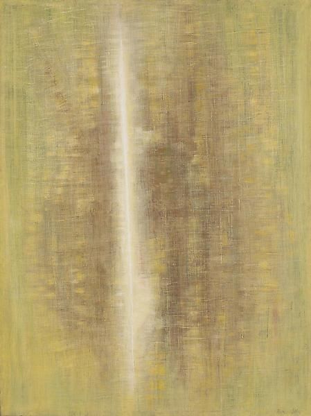 This ‘Untitled’ painting was made by Yun Hyong-keun, and it seems he was playing with ink or heavily pigmented paint on canvas. It's got this great, almost stained quality, like watercolor but with the seriousness of oil. The black is not really black, it's a deep, absorptive tone, more like a memory of darkness. Look how the paint soaks into the canvas, creating these blurred edges, nothing is really hard-edged and the colors bleed into each other. There's a verticality to it, like Rothko's chapel paintings, but with a more intimate scale and a more handmade feel. I'm drawn to where the black meets the green, creating these ambiguous shapes. It makes me think about the relationship between nature and abstraction, how something so simple can evoke such complex feelings. Maybe Agnes Martin was on his mind, or perhaps he was just listening to the materials, letting them do their thing. It is a conversation and exchange of ideas across time. Ultimately, it's up to us to bring our own meanings to it, isn't it?