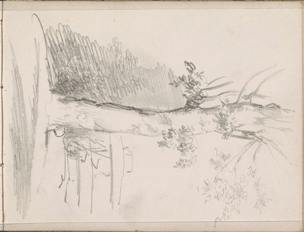Editor: So, this is "Boomgaard," a drawing by Hendrik Abraham Klinkhamer, dating from between 1820 and 1872. It's made with pencil, ink, and pen on paper and it has the feel of a landscape sketch...it's very raw, I think. What do you see in this piece? Curator: I see a moment captured—an interaction between the cultivated and the wild. These old orchards were often spaces where different social classes might intersect, perhaps providing fruit for the wealthy but tended by laborers. Look at the contrast in the rendering of the trees: that very deliberately marked trunk juxtaposed against the free, almost chaotic rendering of the branches. What do you make of that visual tension? Editor: It's like the tree is both a solid, reliable presence and also, in its branches, reaching and almost uncontrollable. Does the tension you mention have anything to do with industrialization perhaps? The way nature changes during the rise of industrialism. Curator: Exactly! It makes me think about how industrialization impacted the view of land ownership, and of labour, at that time. In sketches like this, what is omitted can be just as important as what is shown. Consider the buildings suggested in the background. How might they further inform our reading of the orchard space? Editor: Good point. They are barely defined. Just hinted at with rectangular shapes. If they are part of a homestead, they could tell about those that lived and worked the land. It’s definitely more than *just* a simple tree sketch. Curator: Right, it speaks to labour, land, and how we categorize our surroundings. And perhaps to power. Looking closely, this landscape reminds us that there are rarely pure, untouched spaces. They're always marked by social relations and labour. What will you take away from your viewing experience today? Editor: I am seeing it as a record of cultural exchange and historical issues in agricultural and societal terms! Thanks. Curator: Absolutely, that's what makes these glimpses into the past so relevant and important today.