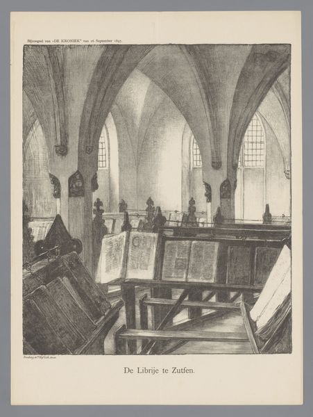 Jacobus Cornelis Kuijper created this photograph of a church interior in Zutphen. The sepia tone suffuses the image with a sense of history and quietude, enhancing the architectural grandeur and solemnity. The composition emphasizes height and depth through the converging lines of vaulted ceilings and rows of pews. Light filters subtly, creating contrasts that highlight the church's structural elements. The photograph captures not just a physical space, but also a sense of timelessness. Consider how Kuijper uses the formal elements of photography to distill the essence of this sacred space. The play of light and shadow, along with the ordered arrangement of architectural forms, invites contemplation on themes of order, faith, and human presence within the vastness of the divine. The use of sepia tones further removes the scene from the immediacy of color, offering a more reflective, almost dreamlike quality.
