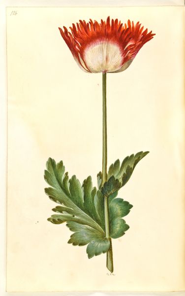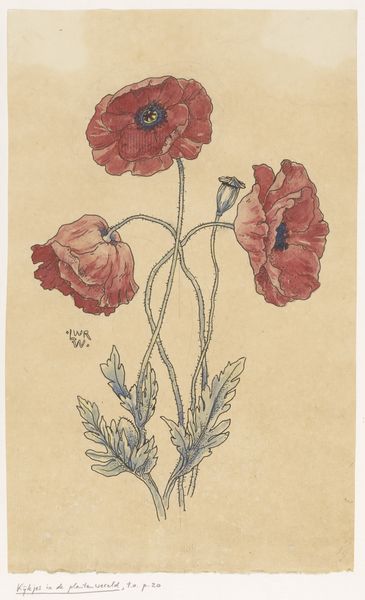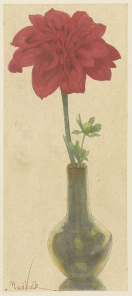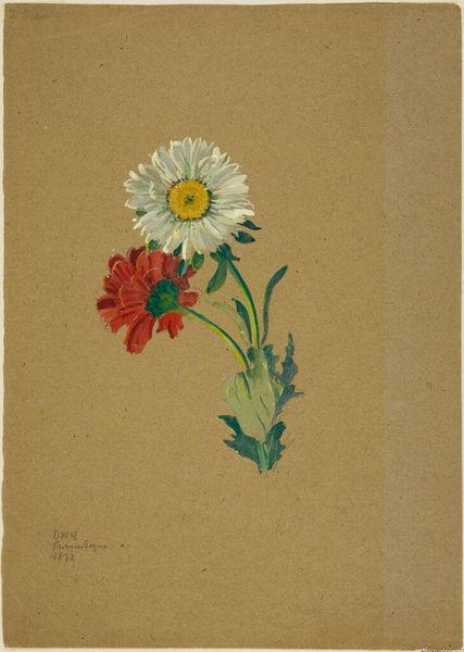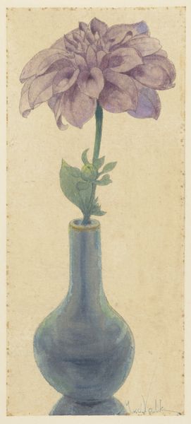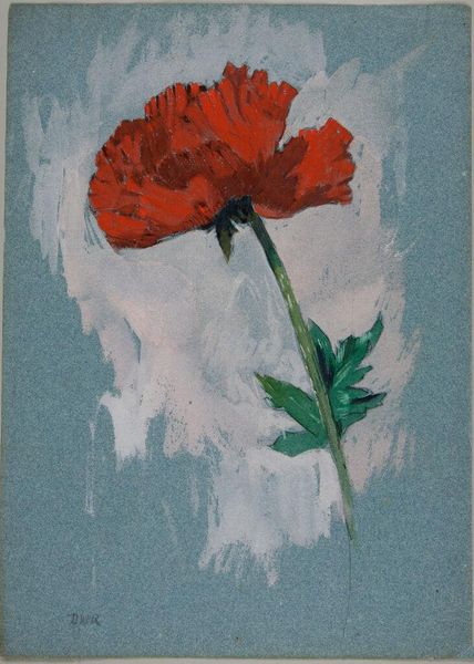 Curator: This is "Flower" by Denman Waldo Ross, currently residing here at the Harvard Art Museums. Editor: It's so delicate, yet striking! The red poppy against that cool blue background just vibrates. Curator: Ross was deeply invested in color theory; he saw color as a language with its own grammar and syntax. This piece is evidence of his principles. Editor: Absolutely. Poppies themselves are laden with symbolism: remembrance, sleep, even death. Here, though, it feels more like a celebration of pure visual sensation. Curator: Color definitely takes precedence. The form is almost secondary. The poppy's cultural connotations are softened. Editor: It makes you think about the power of simple forms to evoke complex emotions. Curator: Indeed, seeing art like this makes us recognize how our perceptions are shaped by cultural and historical forces. Editor: And how deeply personal those perceptions can be!
