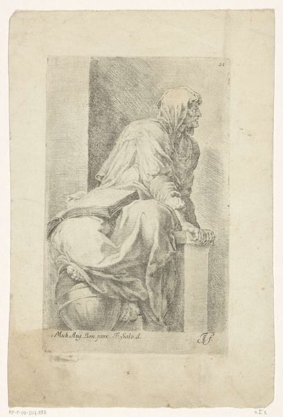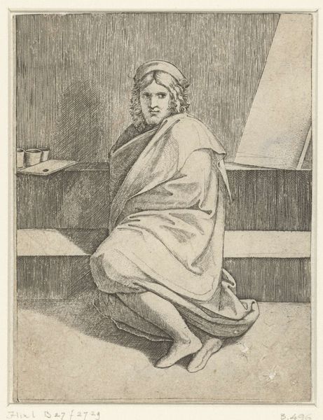 This etching, “Portret van schilder Raphael,” whose maker is currently unknown, lives in the collection of the Rijksmuseum. It’s a copy, an etching of a painting of Raphael. In the Western world, the Renaissance cemented the idea of the artist as a genius, usually male. This image participates in that legacy, portraying Raphael as a divinely inspired figure. We see the artist kneeling, draped in cloth. His gaze is intense. He’s set against a stark background. The focus on Raphael elevates him, yet his downcast posture suggests a humbleness and devotion to his craft. In the history of art, images of men who make art become a way to emphasize the idea of artistic genius. This etching isn't just a portrait; it's a statement about the revered status of artists in society. It invites us to consider how these historical portrayals continue to influence our understanding of creativity, genius, and the role of the artist.