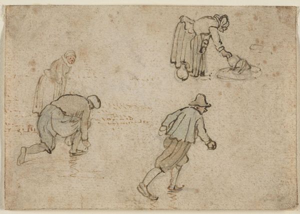 Editor: This is Isaac van Ostade's "Sheet of Studies with Six Figures." It's a pen and brown ink drawing. The figures almost seem to huddle together. What compositional elements stand out to you? Curator: The upper grouping certainly provides a counterpoint to the larger mass below. Consider the dynamism implicit in the diagonal orientation versus the static grouping below. Editor: So, you're saying the artist used placement to create movement and stillness? Curator: Precisely. The application of line, too, is telling; observe how the bolder lines define the foreground figures. What might that signify? Editor: I see it now! The density of line creates a sense of depth. Thanks for pointing that out. Curator: My pleasure. It is through such formal strategies that Ostade constructs meaning.