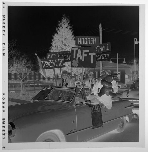 Curator: This photograph by Martin Schweig presents a fascinating look at the materials and context surrounding a mid-century wedding. The car, the clothing, even the handwritten sign – each element tells a story of production and consumption. Editor: It certainly does! It appears to show the back of a wedding car with the sign "Just Married" hanging on it, and a woman watching. What do you see in this piece in terms of materials and social context? Curator: The car itself is a prime example of industrial production and status. And consider the sign—a handmade object juxtaposed with mass-produced items. The inscription speaks volumes about gender roles and expectations of the time. How might the materials used reflect the social dynamics? Editor: That is thought provoking. Thank you for making me see the layers beyond the surface! Curator: It highlights the labor, materials, and consumption interwoven into seemingly simple moments.