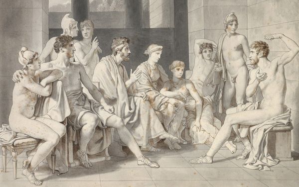 Editor: This drawing, titled 'Fotoreproductie van een illustratie van drie mannen bij een ligbed in een interieur,' made before 1855 by an anonymous artist, is executed in pencil and charcoal on toned paper. The sepia tones give it an aged feel, but I’m intrigued by the composition. What strikes you most about it? Curator: The composition's careful arrangement speaks volumes. Note how the artist uses the receding planes to create depth, guiding our eye from the figures in the foreground toward the implied space behind the column. It is the artist's organization that produces a narrative of space within an interior setting. What role does the disposition of light fulfill within the drawing? Editor: It seems to subtly highlight key figures and elements, creating focal points and adding dimensionality, drawing my eye to certain aspects and imbuing a particular spatial reading, rather than creating atmosphere. Curator: Precisely. Consider the relationship between the lines. Observe the sharp, precise lines defining the figures juxtaposed with the softer, almost atmospheric rendering of the background. The artist creates an interesting counterpoint, one which engages with, and subsequently challenges, a formal viewing position. What assumptions might this formal arrangement encourage the viewer to consider? Editor: Well, the figures' poses evoke a sense of thoughtful discourse. I guess I initially missed some of those subtleties you've pointed out, becoming fixated on it being sepia. Curator: It is rewarding how this close visual analysis unveils the artist's skillful manipulation of form, space and line. Editor: I concur. It transforms how one appreciates the visual dynamics inherent in the artwork.