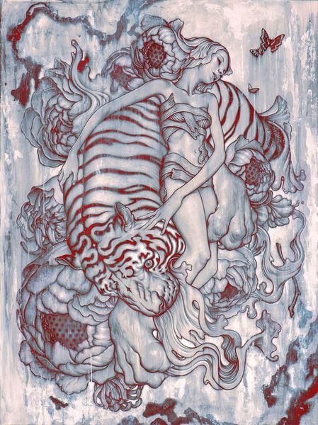 James Jean made this densely rendered image called ‘Goat II’ using blue pencil or ink, and it's a real testament to the power of a limited palette. The whole thing shimmers in these cool, watery tones. Look at the way the artist uses line; it's incredibly intricate, creating textures that feel almost tactile. The surface is alive with detail. Notice the way the goat’s fur is suggested with these tiny, swirling marks, or how the flowing fabric is built up with layer upon layer of delicate lines. The contrast between the smooth areas and the densely worked passages is really striking. This single colour choice gives a dreamlike, surreal quality that reminds me of Odilon Redon's symbolist drawings, but with a contemporary graphic sensibility. It invites us to get lost in its intricate details and find our own meaning within its enigmatic imagery.