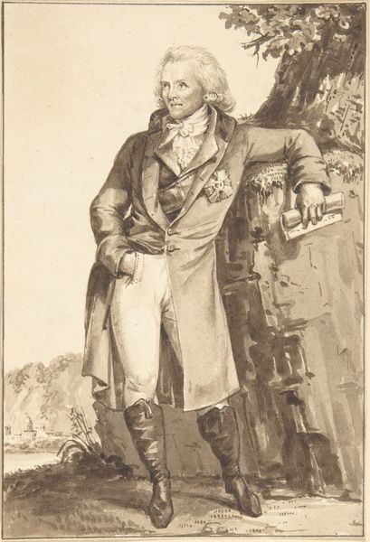 Curator: This drawing, titled "Portrait of G.-L. Leclerc, Comte de Buffon," was created by Jean-Baptiste-François Bosio sometime between 1780 and 1827. It resides here at the Metropolitan Museum of Art and appears to be made of ink, perhaps sepia ink. Editor: Well, my first impression is just a kind of… dreamy elegance. The sepia tone gives it this lovely antique feel. But also there is a man, an environment and is he levitating slightly, I think? Curator: The context here is crucial. Buffon was a prominent naturalist, so Bosio’s depiction highlights his engagement with the natural world through…well…images. Look at the composition. How would you consider the application of the sepia ink in depicting texture and conveying scientific observation? Editor: Ah, a materialist question. Well, that consistent color ties everything together – all the wildlife surrounding Buffon. Is that symbolism or pure scientific representation? Curator: It's both! Bosio clearly intended to convey Buffon's holistic understanding of nature – from flora to fauna. But what intrigues me are the choices in terms of labor. The use of sepia ink allows the hand to remain visible, foregrounding that the artist used specific knowledge about how Buffon perceived nature. Editor: True! And sepia ink…isn’t that from cuttlefish? Knowing that gives this portrait an organic vibe that fits Buffon perfectly. He probably would have appreciated the connection, a bit meta, maybe! So Bosio really uses material to echo meaning, blurring lines between art, craft, and observation. It makes me want to wander through an 18th century menagerie, journal in hand. Curator: Indeed. It shows how the means of art-making, and its materials are all linked to scientific investigation of nature, how they could merge in unexpected and sometimes unstable ways. And that is worth some meditation today. Editor: Exactly, that portrait is more than ink, paper and history, it is alive with a kind of imaginative engagement to both nature and knowledge. It definitely adds another dimension for anyone looking.
