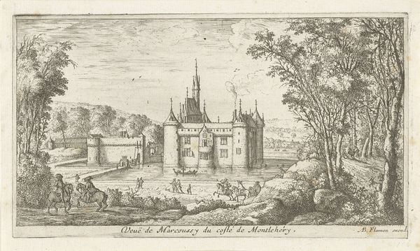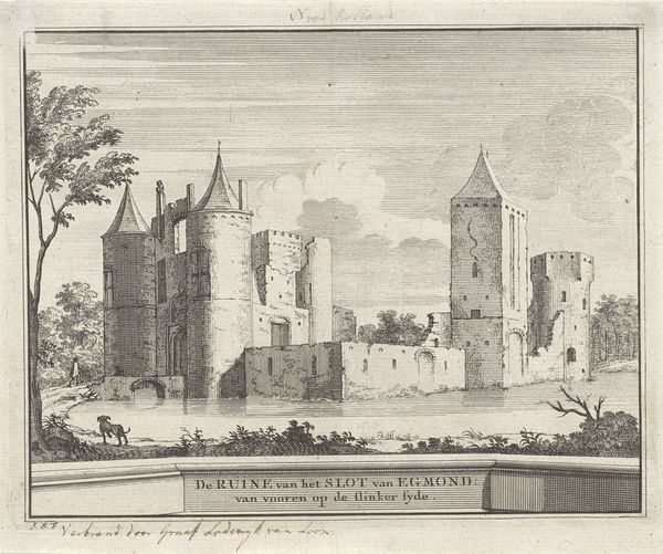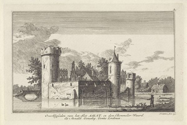 This engraving presents the Rosendael Castle, its formidable round tower and surrounding moat evoking strength and isolation. The tower itself is an ancient symbol—a watchtower, a sentinel against the unknown, reminiscent of similar structures across medieval Europe. The image is striking in its resemblance to earlier depictions of, say, the Tower of Babel—a structure laden with hubris, yet also symbolizing humanity’s aspirations, our reach towards the heavens. In the collective psyche, the tower represents both protection and imprisonment. Consider the way the castle looms, its reflection mirrored in the water, almost like a subconscious echo, doubling its presence. It is as if the castle and its reflection are locked in a dialogue across time, where the past and present merge. This scene invites us to reflect on how symbols and architectural forms persist and evolve, carrying complex layers of meaning through generations.