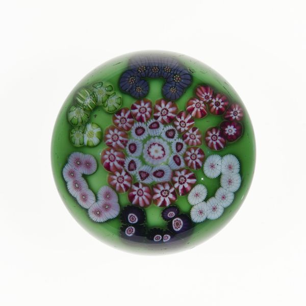 This Paperweight was made at the Clichy Glass Works, out of glass. Glassblowing is an ancient technique, dating back to the Roman Empire, and it's all about controlling molten material. Here, we see a careful arrangement of colorful florets encased in clear glass. These delicate details aren't painted on; they're created through a complex process called millefiori, which involves layering different colors of glass canes. The glassblower manipulates the molten glass, shaping it with tools and breath. This paperweight would have required considerable skill, as it had to be perfectly formed, and free from imperfections. It's a testament to the glassblower's ability to coax beauty from a challenging material. While glassblowing has an industrial dimension, producing utilitarian objects, here we see it elevated to an art form. Next time you see a glass object, consider the labor and skill that went into its creation. It's a reminder that even everyday objects can be imbued with artistry.