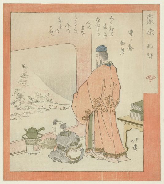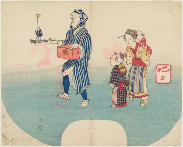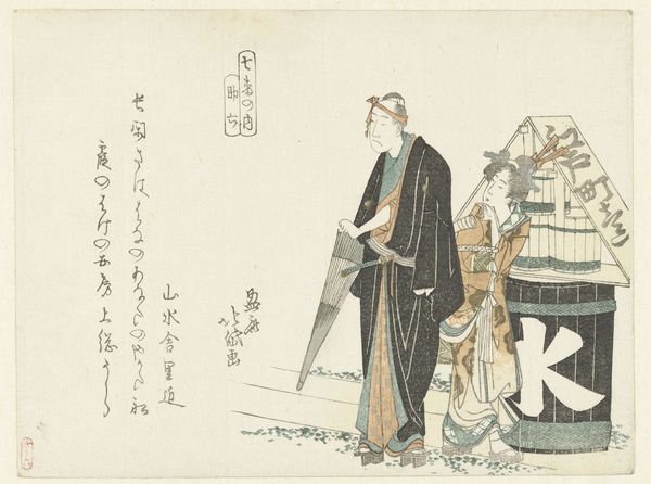 Curator: Hishikawa Sōri created this captivating woodblock print, "Two Women on a Shrine Visit," around 1804. The print now resides in the collection of the Rijksmuseum. I am immediately struck by how ordinary, how domestic it feels. Editor: Despite its delicate nature, it's teeming with layers. These are not just "women," they're carriers of symbolic weight within this society. That first figure, holding perhaps a swaddled baby— a representation of renewal, new beginnings, and, naturally, societal continuity. Curator: Exactly! Considering this is an Ukiyo-e print, it was designed for mass production. This informs how we view its impact on 19th century consumers. Were such prints a way to broadcast very traditional roles for women or did people appreciate them solely for aesthetics and affordable access to artistic expressions? Editor: Well, examine how the garments are rendered with patterns holding multiple meanings. We see on one dress a kind of swastika shape that has been culturally co-opted by nefarious factions in more recent history, and yet is not tied at all to those factions in Japanese history and the work's moment. In other words, these symbols resonate quite powerfully within and beyond Japanese cultural memory and perhaps meant blessings, or continuity and could signify a connection to cosmic forces, enhancing her revered status in the depicted context. Curator: You bring up a great point. We must remember the historical distance and its effects on cultural comprehension and reception. Given the meticulous production of each print, it underscores how labor-intensive such projects were, which ultimately added economic value to the object, despite the intention of affordability for mass consumption. It's not just an image; it represents time, process and production. Editor: And I see how easily, despite its quietude, such everyday activities transformed to represent layers of historical context. These women attending a shrine is less a snapshot, and more a portal into cultural traditions passed, transformed and lasting eras. Curator: Precisely. Investigating the raw materials needed for this art sheds even more light into our comprehension. And to bring all of that insight together? It shifts the conversation around Ukiyo-e art and challenges its place within art history. Editor: Seeing beyond just 'genre painting', understanding those lasting themes reflected via the symbolism reminds me of why studying art matters. Thanks!