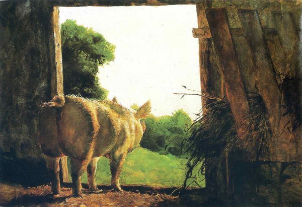 Editor: This is Jamie Wyeth’s “Pig and Train” from 1977. The textures are incredible. It feels very...American, somehow. What's your take on this scene? Curator: Well, seeing this image, I immediately consider how industrialization impacted rural America. Wyeth places these two potent symbols, the pig and the train, in stark juxtaposition. Think about the pig, a symbol of rural life and sustenance, set against the train, a roaring emblem of technological advancement and societal change. How might a rural community have viewed this increasingly pervasive technology? Editor: That makes me wonder, was Wyeth trying to create tension between those two symbols? Curator: Absolutely. It raises questions about the value systems that shaped this landscape. He's placing those symbols of a simpler agrarian past, like the pig, against this advancing future of industry. Now, the visual composition emphasizes this contrast, doesn't it? Editor: It does! The pig is much closer to the viewer than the train. It's more vivid and life-sized and very... pink. Curator: Right. The pig is rendered with an almost portrait-like focus. The train is much more distant, becoming an almost dream-like element on the horizon. What does that placement imply about our ability to control how society changed with technology? Editor: It's subtle, but there’s a definite statement here, a push and pull between progress and what is lost. Curator: Precisely. And by showcasing them together in a single frame, Wyeth invites us to contemplate that intricate relationship. It’s about interrogating whose stories are prioritized when societies rapidly transform. Editor: I'm seeing this artwork in a totally new light now, thank you! Curator: It's my pleasure, seeing art is a journey, an excavation. This pairing encourages dialogue, and ultimately a better understanding of history's multifaceted impacts.