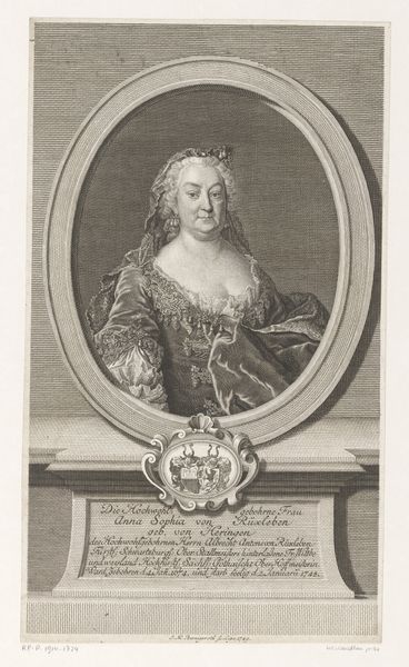 Curator: I find myself quite drawn to the work before us, Maurice Blot's "Portrait of a Woman with Pearls, after Schalcken," created between 1780 and 1781. It's an intaglio print—an engraving to be precise. Editor: The immediate impression for me is one of quiet elegance. The oval frame within the rectangular print really focuses the viewer's gaze. What strikes you most from a historical context? Curator: Well, this work is based on Godfried Schalcken's painting, so it enters into a conversation about copies, dissemination of imagery, and the role of printmaking in circulating aristocratic ideals and portraiture during the late 18th century. Blot, by reproducing Schalcken's work, is not only displaying technical skill, but he's also participating in a larger visual culture that emphasized emulation of earlier masters. Editor: Yes, but let's consider the formal elements, shall we? The fineness of the engraved lines creates a wonderful sense of depth and texture, particularly in rendering the fabrics and the pearl necklace. The artist shows skill in contrasting light and dark. How might that serve social or political ends? Curator: The pearls, lace, and hairstyle certainly speak to status, perhaps suggesting this woman was part of a refined, privileged world on the verge of massive upheaval. Prints such as this helped construct notions of taste and sophistication amongst the rising bourgeoisie. By viewing the elite one could emulate the behavior and habits that signaled refinement. Editor: Do you find that this close attention to detail distracts from the individual humanity? There's a certain formality to her gaze. It creates a sense of distance. It has me wonder, did these women have real agency or were they just blank slates upon which social ideals are inscribed? Curator: An excellent question! One could argue that by creating prints from existing paintings, artists like Blot indirectly amplified their sitters. In terms of accessibility and distribution, that is. However, whether that visibility equaled "agency" remains debatable. These works provide insights into how individuals navigated social norms of that era. Editor: Ultimately, Blot has offered us a very lovely snapshot that lets us think about aesthetics and larger issues about class and representation. Curator: Precisely. And his print allows us to have conversations with and about works of the past.