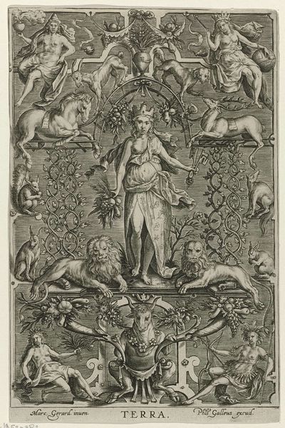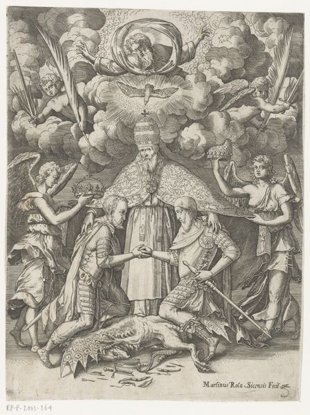 Cherubino Alberti created this print, *Portrait of Pope Urban VII in a decorative border*, using engraving. Notice how the image is structured around a central oval frame, a classic Renaissance form. Alberti uses line and form to create a detailed, allegorical portrait. The Pope is framed by symbols of justice, charity, and cherubic figures, alluding to his spiritual and temporal power. Light emanates from behind the papal tiara, adding drama and emphasizing Urban VII’s divine authority. However, this image transcends mere religious iconography. Alberti manipulates the visual language of power and virtue. The crisp lines and balanced composition suggest order, yet the dynamic poses of the figures hint at a world in flux. We could interpret the print through a semiotic lens, where each element – the scales of justice, the nurturing mother, the radiant light – functions as a signifier within a complex system of meaning. Ultimately, the engraving's visual impact lies in Alberti's formal control. This control invites us to consider the image not just as a representation of a pope, but as a sophisticated exercise in visual rhetoric, a symbolic dance of power and representation, forever open to interpretation.